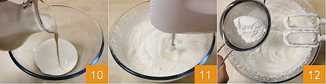 Passez maintenant à la préparation de la chantilly pour la garniture (vous pouvez consulter la procédure ici : comment monter la chantilly). Versez la crème liquide bien froide dans un grand bol 10 et avec les fouets froids d'un batteur électrique, montez la crème en chantilly 11. Ajoutez à ce stade le sucre glace tamisé 12 et incorporez-le à la crème avec une spatule en mélangeant de bas en haut pour qu'elle ne retombe pas et réservez-la.