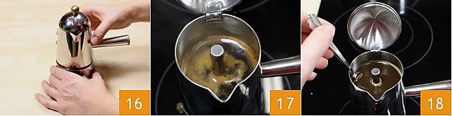 Ne pressez pas avec la cuillère, ne faites pas de trous et vissez bien la cafetière 16 (pour éviter que le café ne s'échappe des côtés en montant), puis placez-la sur une flamme basse et constante, pour obtenir un café corsé. Au fur et à mesure que le café monte, une mousse dense se formera 17 ; nous recommandons de ne pas laisser bouillir trop longtemps le café, pour en préserver l'arôme et la douceur. Éteignez donc le feu, mélangez directement le café dans la cafetière avec une cuillère pour le rendre plus homogène 18 et votre café à utiliser dans la préparation est prêt.