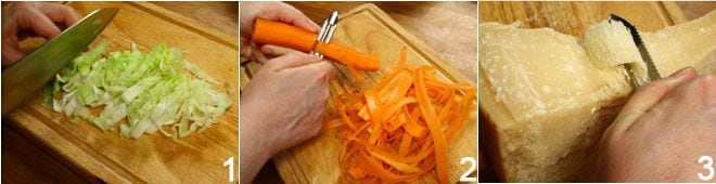 Lavez et séchez les feuilles de laitue iceberg, coupez-les finement 1 et mettez-les dans un grand saladier. A l'aide d'un éplucheur, épluchez et coupez les carottes en rubans 2 ; toujours avec l'éplucheur, réalisez des copeaux à partir d'un morceau de parmesan entier 3 (ou de grana padano).