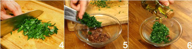 Hachez finement le persil 4 et les filets d'anchois et mettez-les dans un bol 5 avec de l'huile 6 (et si vous aimez, du vinaigre), du sel et du poivre moulu ; mélangez les ingrédients avec une fourchette et laissez-les reposer quelques minutes.