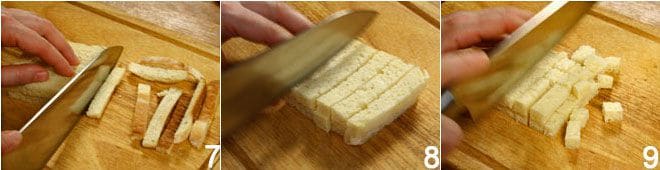 Prenez les tranches de pain de mie, enlevez les bords les plus foncés 7 et coupez-les en cubes de 1 cm de côté (8-9).