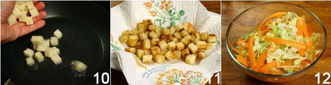 Mettez deux cuillères à soupe d'huile d'olive extra-vierge dans une poêle, faites-la chauffer puis ajoutez-y les cubes de pain à feu moyen 10, en les retournant de tous les côtés pour les dorer entièrement. Une fois dorés, mettez-les sur du papier absorbant de cuisine pour éliminer l'excès d'huile 11. Ajoutez aux laitues iceberg les carottes 12,