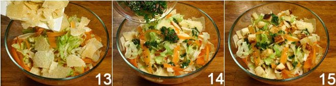les copeaux de parmesan 13 et l'assaisonnement d'huile et de persil 14 : mélangez délicatement les ingrédients, répartissez la salade dans les assiettes de service puis ajoutez les croûtons de pain croquants 15. Servez immédiatement.