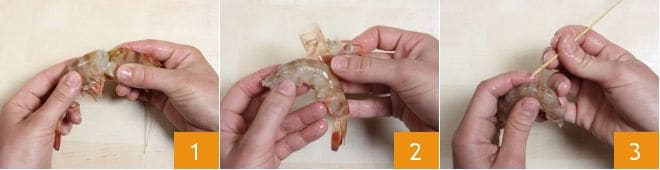 Pour réaliser la salade de pois chiches, crevettes et roquette, commencez par nettoyer les crevettes (ou les gambas), retirez la tête 1, la carapace 2 et l'intestin en vous aidant d'un cure-dent en bois 3, pour tous les détails de ce processus, consultez notre fiche Comment nettoyer les crevettes de notre École de cuisine.