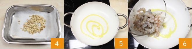 Maintenant, grillez les pignons : placez-les sur une plaque recouverte de papier sulfurisé et faites-les cuire dans un four préchauffé à chaleur statique pendant environ 10 minutes à 150° (ou dans un four à chaleur tournante à 130° pendant 5-6 minutes) 4 et mettez-les de côté, si vous préférez, vous pouvez aussi les griller dans une poêle. Chauffez un filet d'huile dans une poêle avec l'ail 5, ajoutez les gambas 6