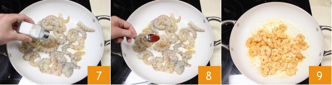salez 7, poivrez et ajoutez finalement le paprika. Faites-les cuire à feu vif pendant 5-6 minutes (ajustez la cuisson selon la taille des gambas, si elles sont très grosses, elles auront besoin de quelques minutes supplémentaires). Une fois cuites, transférez-les dans un petit bol pour qu'elles refroidissent.