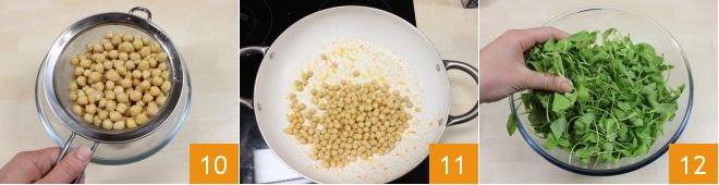 Maintenant, égouttez les pois chiches précuits 10. Nous avons utilisé des pois chiches précuits, mais vous pouvez aussi utiliser ceux secs en prenant soin de les faire tremper pendant 12 heures ; une fois le temps nécessaire écoulé, égouttez les pois chiches, rincez-les et faites-les cuire dans une casserole pendant au moins 3 heures ou dans une cocotte-minute pendant une heure à une heure et demie, de préférence à feu doux ; une fois cuits, ils seront prêts à être ajoutés à la préparation. Dans la même poêle utilisée pour les gambas, réchauffez les pois chiches 11 afin qu'ils absorbent la saveur des crustacés). Maintenant que tous les ingrédients sont prêts, vous pouvez composer la salade : dans un grand bol, mettez la roquette lavée et séchée 12.