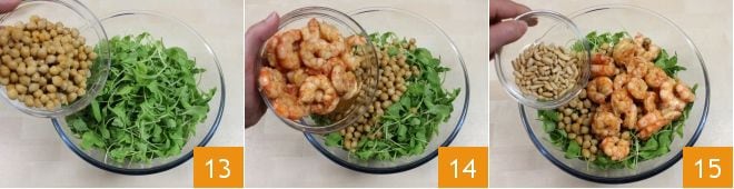 Ajoutez les pois chiches 13, les gambas 14 et les pignons grillés 15.