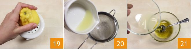 Pressez le jus d'un demi-citron 19, filtrez-le 29 et ajoutez-le à l'émulsion 21,