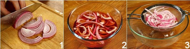 Versez les haricots avec leur eau de conservation dans une passoire, puis rincez-les rapidement sous l'eau courante et laissez-les bien égoutter. Épluchez et coupez finement en tranches l'oignon de Tropea 1, puis placez-le dans un bol avec un verre de vinaigre de vin et recouvrez ensuite d'eau froide ; laissez tremper pendant environ une demi-heure, puis égouttez-le 3.