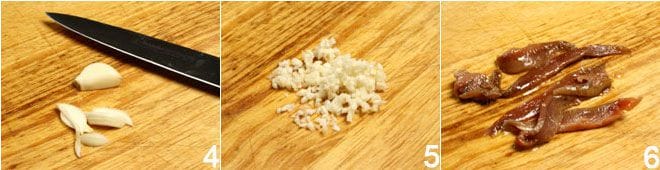 Pendant ce temps, épluchez l'ail 4, hachez-le finement et mettez de côté 5. Passez aux anchois, disposez-les sur la planche à découper 6