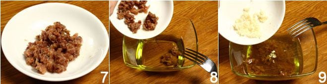 émincez également ceux-ci finement 7 puis versez-les dans un petit bol avec l'huile 8 et l'ail haché 9