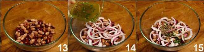 Versez les haricots dans un bol 13, ajoutez l'oignon de Tropea et la sauce préalablement obtenue 14; mélangez le tout et servez, en saupoudrant les assiettes de service de poivre moulu frais et de feuilles de thym 15.