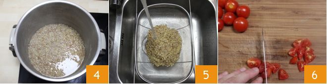 Une fois cuits, ils auront absorbé une partie de l'eau 4, égouttez-les et passez-les sous l'eau froide courante pour arrêter la cuisson et les refroidir 5; transférez-les dans un grand bol et réservez. Occupez-vous maintenant des tomates : lavez-les sous l'eau courante et coupez-les en petits quartiers 6,