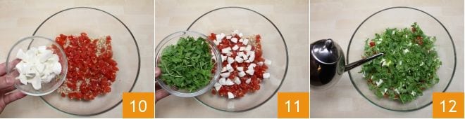 éliminez l'eau de conservation des boules de mozzarella et coupez-les en dés 7. Nettoyez la roquette et rincez-la bien sous l'eau; hachez grossièrement également les feuilles de roquette 8. À ce stade, prenez le bol avec les céréales et ajoutez les tomates cerises 9,