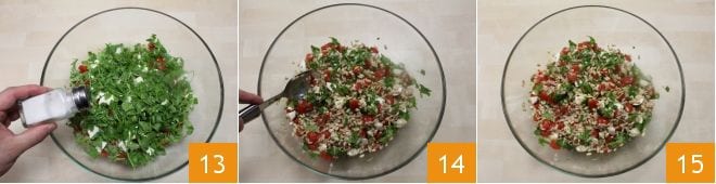 et éventuellement ajustez le sel 13. Mélangez avec une cuillère pour que les céréales s'imprègnent du condiment 14. Votre salade d'épeautre et d'orge estivale est prête à être dégustée 15 et servie froide.