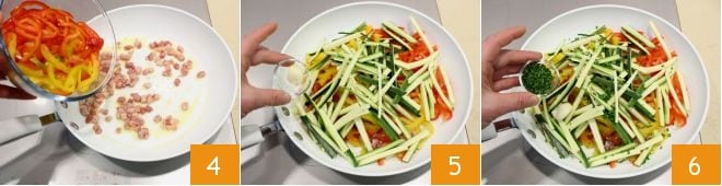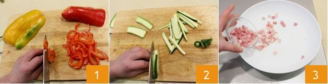 Pour préparer la salade de pâtes rustique, lavez les poivrons, coupez-les en deux, retirez les graines et les filaments blancs internes, puis coupez-les en lanières 1, lavez, équeutez les courgettes et coupez-les également en lanières 2. Dans une poêle, faites revenir les dés de lard fumé quelques minutes 3.