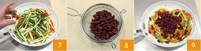 Ajoutez également le piment rouge haché 7. Faites cuire pendant 10 minutes à feu vif. Maintenant, égouttez les haricots rouges (précuits) de leur eau de conservation 8 (si vous utilisez des haricots secs, vous devrez les tremper dans l'eau pendant 12 heures puis les cuire) et versez-les dans la poêle avec les légumes 9. Continuez la cuisson pendant quelques minutes : les légumes ne doivent pas s'effondrer mais rester croquants. Ensuite, retirez la gousse d'ail et laissez-les refroidir.