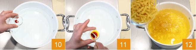 Portez à ébullition une casserole pleine d'eau salée, prélevez une cuillère à café d'eau chaude pour dissoudre le safran (10-11), puis versez-le dans l'eau de cuisson. Versez les pâtes et faites-les cuire selon le temps indiqué sur le paquet 12.