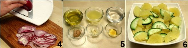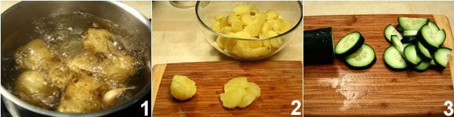 Lavez les pommes de terre et mettez-les à cuire dans de l'eau salée avec une gousse d'ail en chemise, pendant environ 30/35 minutes 1 (le temps de cuisson dépend de la taille des pommes de terre), égouttez-les et après les avoir épluchées avec un couteau, laissez-les refroidir et coupez-les en tranches d'environ 1 cm d'épaisseur 2. Si les tranches sont trop grandes pour être mangées en une bouchée, coupez-les en deux. Mettez de côté l'ail qui vous servira pour préparer la vinaigrette. Lavez le concombre et coupez-le en rondelles 3 en gardant la peau.