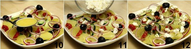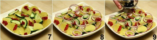 Égouttez et coupez les tomates séchées et dispersez les filets sur la salade 7 de pommes de terre et concombres. Ajoutez quelques rondelles d'oignon rouge 8, les olives noires 9.