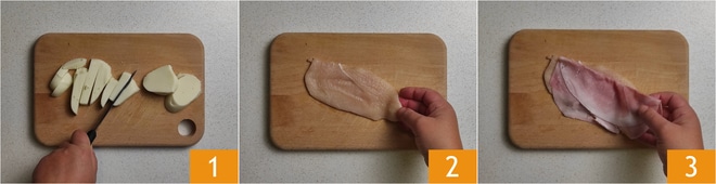 Pour préparer les roulades de poulet à la poêle, commencez par couper la scamorza en bâtonnets d'une épaisseur de 1 cm 1. Déposez la tranche de poulet sur une planche à découper 2 et superposez une tranche de jambon 3.
