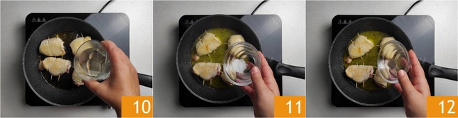 Déglacez avec du vin blanc 10 et laissez évaporer toute la partie alcoolique. Ajustez avec du sel 11 et du poivre 12.