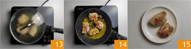 Couvrez avec un couvercle 13 et faites cuire pendant 10 minutes à feu doux. Retirez le couvercle, augmentez le feu, et continuez à cuire pendant quelques minutes, juste le temps de faire sécher la sauce 14. Vos roulades de poulet à la poêle sont prêtes à être servies 15.