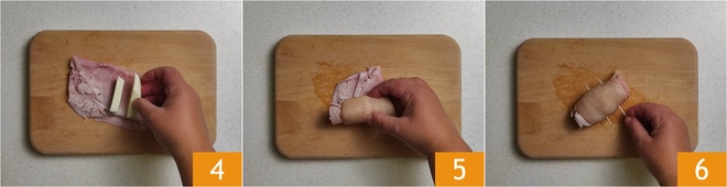 Placez au centre deux bâtonnets de scamorza 4, roulez 5 et fixez avec deux cure-dents 6.