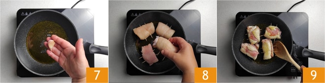 Dans une poêle, versez l'huile, ajoutez l'ail en chemise 7 et faites frire pendant quelques minutes. Mettez les roulades dans la poêle 8 et faites-les dorer, à feu vif, de chaque côté 9 pendant 3-4 minutes.