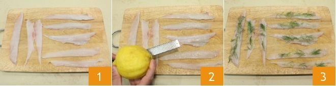 Pour réaliser les roulades de sole au jambon cru, coupez les filets de sole en deux et déposez-les sur une planche à découper 1 (si vous avez acheté une sole entière, vous devrez la nettoyer et la fileter, pour vous aider vous pouvez suivre notre fiche Comment nettoyer la sole). Salez et assaisonnez les filets avec du zeste de citron râpé 2 et des brins d'aneth 3.