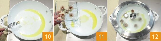 retirez l'ail avec une pince 10 et déposez les roulades dans la poêle 11. Couvrez avec le couvercle 12 et faites cuire pendant 10 minutes