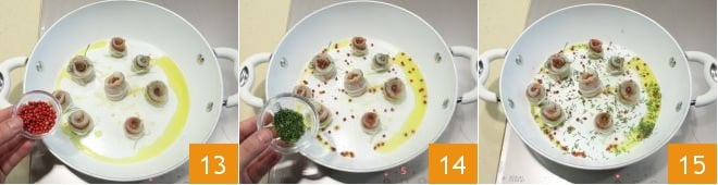 puis aromatisez avec du poivre rose en grains 13 et de l'aneth haché 14. Les roulades de sole au jambon cru sont prêtes à être servies, bien chaudes 15 !
