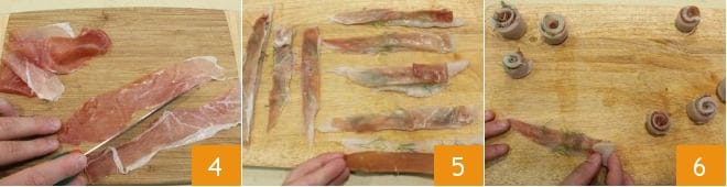 Coupez le jambon en tranches fines de la taille des filets de sole 4 et disposez-les sur chaque filet 5. Enroulez le filet pour créer un petit rouleau 6.