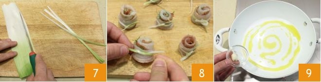Puis épluchez le poireau en éliminant les extrémités et les feuilles extérieures, après avoir enlevé la première couche de feuilles, prenez-en une et utilisez-la pour découper des petites bandelettes qui vous serviront à fixer les rouleaux. Coupez le poireau dans le sens de la longueur pour obtenir des fils fins 7 à enrouler autour de la roulade 8. Chauffez l'huile dans une poêle et faites dorer l'ail pendant quelques minutes 9, juste le temps de parfumer l'huile,