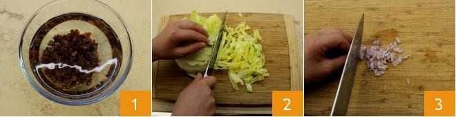 Pour préparer les roulades de chou farcies de riz et scarole, mettez sur le feu une casserole avec beaucoup d'eau salée pour préparer le bouillon de légumes. Pendant ce temps, prenez les raisins secs, mettez-les dans un bol et recouvrez-les d'eau tiède pour les ramollir 1, en les laissant tremper pendant au moins 10 minutes. Passez maintenant aux légumes : lavez sous l'eau fraîche courante la scarole, coupez-la en lanières 2 et mettez-la de côté, puis hachez finement l'échalote, qui sera la base de la sauce 3.