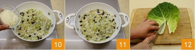 Salez et poivrez à votre goût, puis, une fois que le riz est prêt, éteignez le feu et faites fondre en ajoutant le pecorino râpé 10. Laissez le riz tiédir 11 et occupez-vous du chou ; effeuillez le chou et enlevez la nervure centrale, en incisant un triangle avec un couteau 12. Pendant ce temps, mettez sur le feu une casserole avec beaucoup d'eau salée qui servira à faire bouillir le chou.