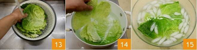 Lavez bien les feuilles en les passant sous l'eau fraîche courante 13 et, lorsque l'eau aura atteint le point d'ébullition, faites-les cuire pendant quelques minutes 14. Entre-temps, préparez un grand bol avec de l'eau et des glaçons qui servira à arrêter la cuisson du chou et à faire en sorte que les feuilles conservent une couleur brillante ; après avoir blanchi les feuilles, égouttez-les et mettez-les quelques instants dans le récipient que vous avez préparé 15.