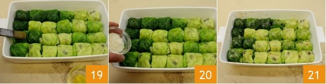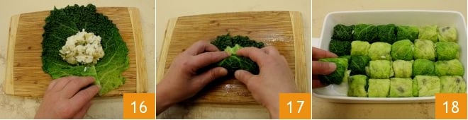 À ce stade, vous pouvez procéder à la préparation des roulades : disposez au centre de chaque feuille de chou une cuillère de riz 16; avec vos mains, roulez délicatement la roulade et fermez-la ensuite en paquet 17 : avec ces doses, vous devriez obtenir 12 roulades de chou. Si vous souhaitez réaliser des roulades plus petites, vous pouvez diviser les feuilles en deux dans le sens de la longueur, puis les remplir, obtenant ainsi 24 portions. Huilez un plat de cuisson de 20x30 cm et disposez les roulades les unes à côté des autres avec la partie repliée vers le bas 18.