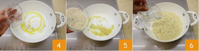 Dans une casserole antiadhésive, faites revenir à feu moyen l'huile et l'échalote hachée 4, puis ajoutez le riz 5. Faites griller le riz pendant 2-3 minutes puis déglacez avec le vin blanc 6.