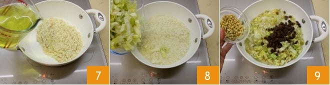 Faites cuire à feu moyen pendant 20 minutes, en ajoutant une ou deux louches de bouillon de légumes filtré chaque fois que le précédent sera évaporé 7; mélangez bien avec la spatule et, 5 minutes avant la fin de la cuisson, ajoutez la scarole coupée en lanières 8. Égouttez bien les raisins secs avec une passoire à mailles fines puis ajoutez-les au riz avec les pignons 9.