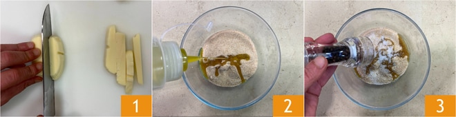 Pour préparer les roulades de veau et speck, commencez par couper la provola en tranches 1 puis en dés. Versez la chapelure dans un bol et assaisonnez avec de l'huile 2, du sel et du poivre 3.