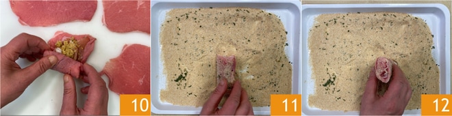 Fermez d'abord les côtés longs de la tranche puis roulez en partant du côté court 10. Passez les roulades dans la chapelure en vous assurant de recouvrir tous les côtés 11 12.