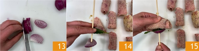 Coupez l'oignon en tranches assez épaisses 13. Composez les brochettes en enfilant sur les bâtonnets de bois dans l'ordre : oignon, laurier 14, roulade 15.