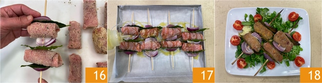 Poursuivez avec un autre oignon, laurier, roulade. Terminez avec une autre feuille de laurier et une tranche d'oignon 16. Disposez les brochettes sur une plaque recouverte de papier sulfurisé et arrosez-les d'un filet d'huile 17. Faites cuire au four à 180°C pendant 25 minutes. Puis augmentez la température à 200°C et poursuivez la cuisson pendant encore 5 minutes en mode gril. Sortez du four et laissez tiédir : vos roulades de veau avec speck sont prêtes à être dégustées. Servez-les avec une salade fraîche de mâche et de tomates cerises 18 !