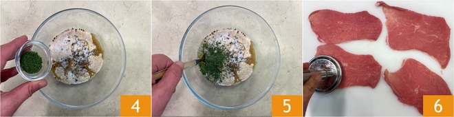 Ajoutez également le persil séché 4 et mélangez pour amalgamer les ingrédients 5. Versez la chapelure aromatisée sur un plateau. À ce stade, battez délicatement les tranches de veau avec un attendrisseur 6.