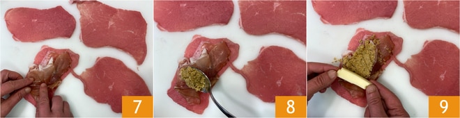 Disposez deux tranches de speck sur chaque tranche de viande 7, puis recouvrez de chapelure 8 et ajoutez un morceau de provola 9.