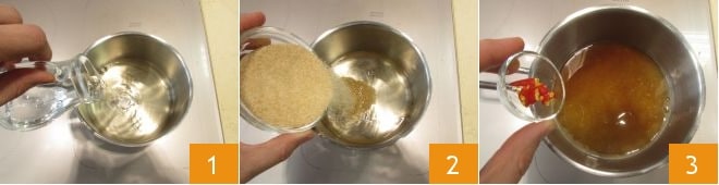Pour réaliser les rouleaux vietnamiens, commencez par préparer la sauce aigre-douce d'accompagnement. Dans une petite casserole, versez le vinaigre de riz, l'eau 1, le sucre de canne 2 et le piment grossièrement haché 3.