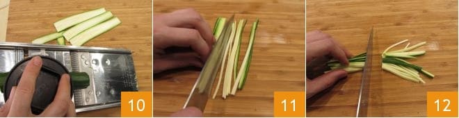 Lavez bien aussi les courgettes et toujours à l'aide de la mandoline découpez des tranches de la même épaisseur que les carottes (2 mm) 10. Coupez également ces tranches en julienne 11 puis encore en deux 12.
