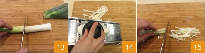 Prenez le poireau, éliminez la partie la plus verte et les feuilles, et en pratiquant une incision verticale, prélevez seulement la partie centrale, puis coupez-la en deux 13. Passez également ceci à la mandoline 14 et coupez à nouveau en deux les lanières de poireau 15.